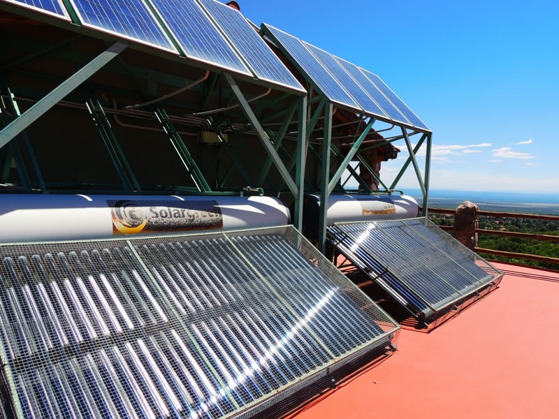 Los eco-aparts de la Hostería Vegetariana, en total consonacia con los conceptos eco-vegetarianos, se abastece de energías renovables para generar la iluminación y el agua caliente. Para iluminar las unidades, el camino interno y el parque circundante, se utilizan dos sistemas de generación, uno fotovoltaico compuesto por paneles solares y otro eólico, a través de un molino generador. El abastecimiento de agua caliente se realiza por medio de dos termotanques solares de 300 lts. c/u. Este sistema contribuye a evitar la contaminación ambiental que producen las fuentes habituales que se utilizan para abastecer de luz y agua caliente. De esta forma la Hostería Vegetariana es el primer y único complejo turístico de Villa de Merlo que utiliza energías renovables, actuando de este modo en perfecta armonía con el ambiente.